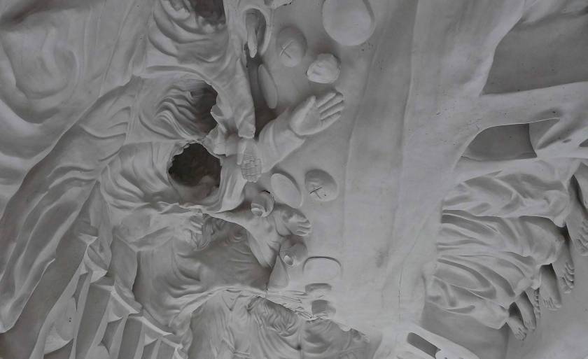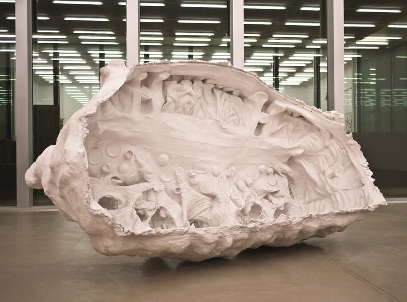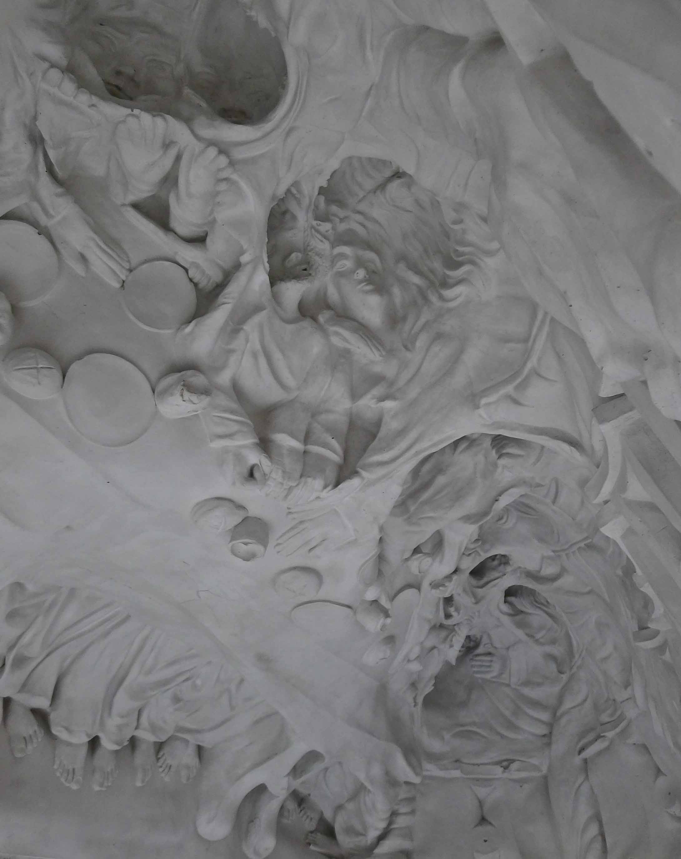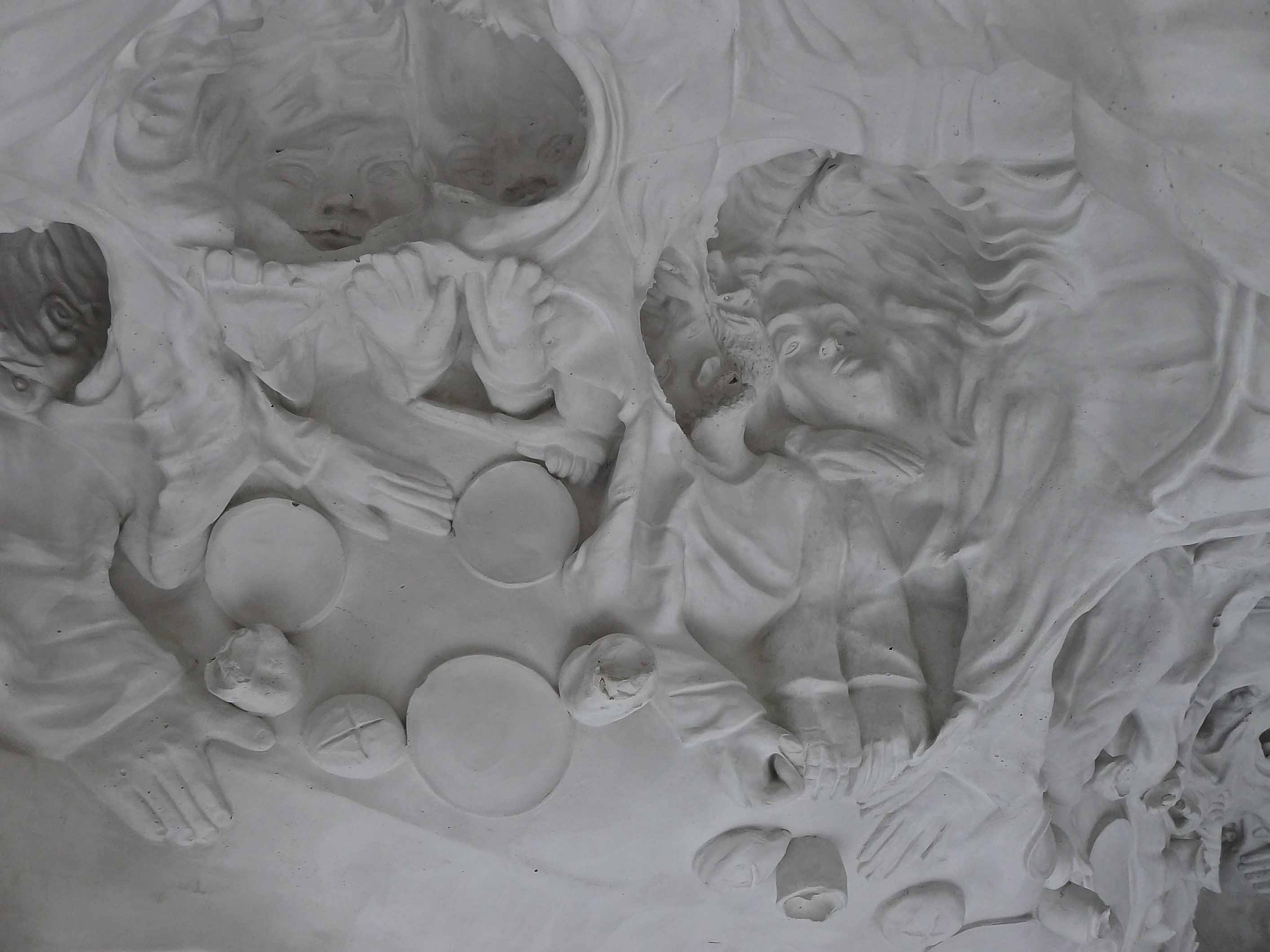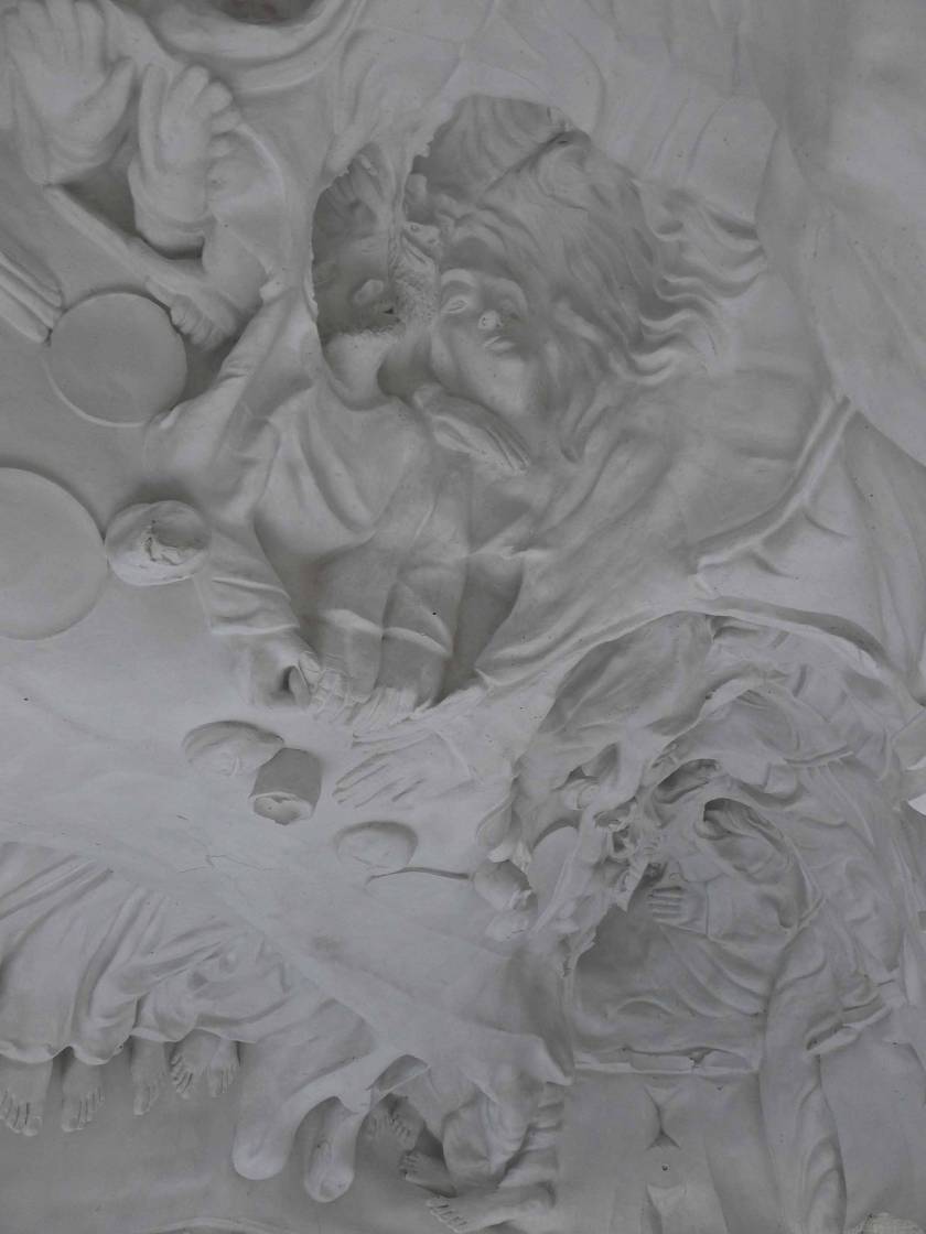 The famous religious scene has been turned on its head quite literally in Amitlu Anec. A small replica of Last Supper from a souvenir shop was reproduced to a human scale whose mold was then manipulated and re-worked to create a piece that is neither an inversion or a negation of the original form. Something so familiar to our eyes has become something foreign and disorienting with a complex interplay between the positive forms and the absent ones. Whereas in the original 3-D depiction of this iconographic image, the wholeness helps us understand the narrative, here we see the nonsensicalness in the whole. The piece is placed on its side with the feet pointing to the sky like an open shell revealing its contents step by step, detail by detail, albeit in an anarchic manner.