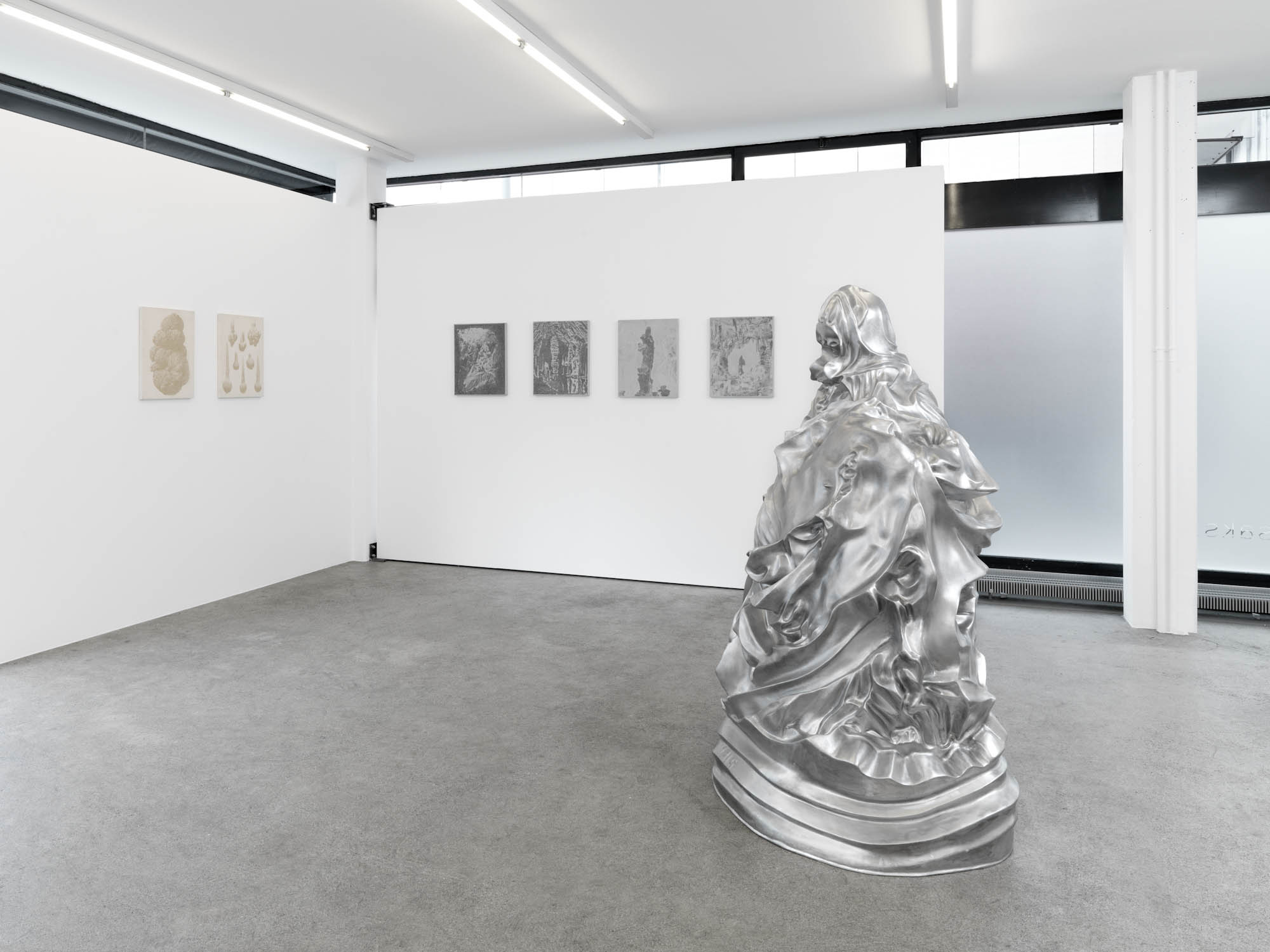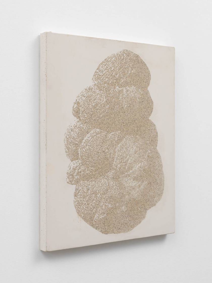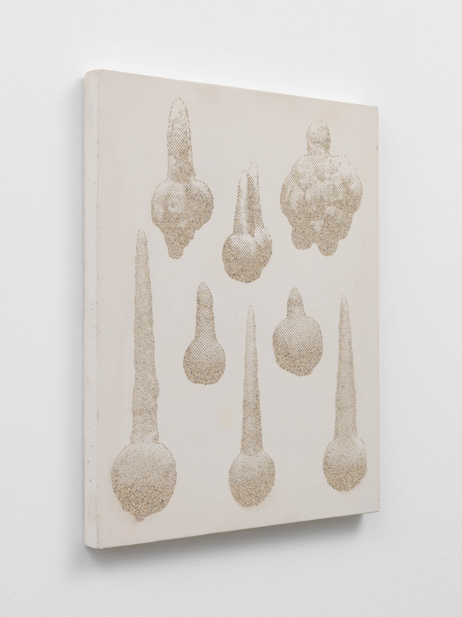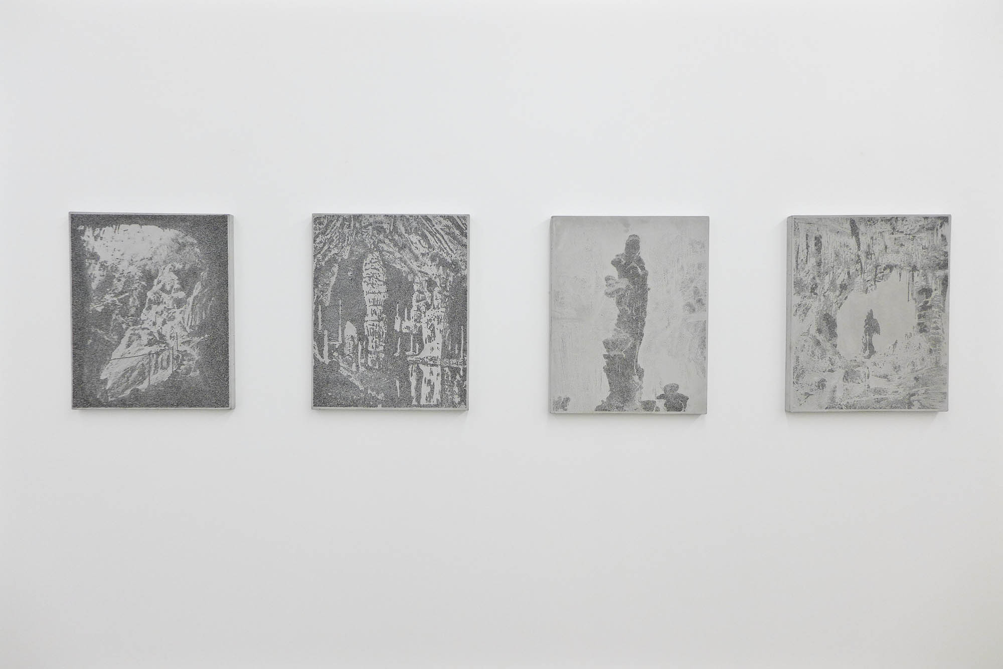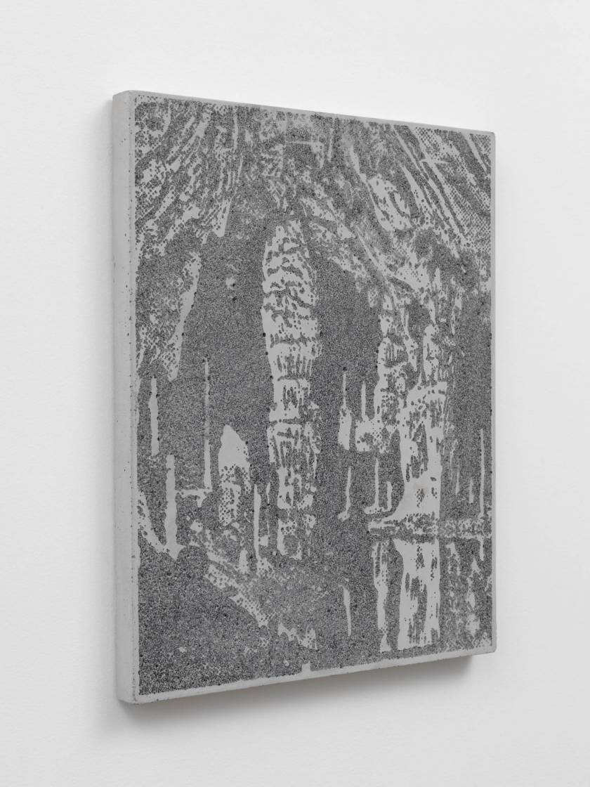 Des objets et des lieus issus d’origine minérale sont chargées de sens par leur forme suggestive. La grotte devient une cathédrale, une stalagmite est adorée comme une madone, des concrétions collectionnées comme des reliques. Quand la forme précède le sens. Et ce sont ces formes que l’artiste a transféré sur des plaques de béton comme des plaques photographiques par un procédé d’acidage qui ronge le ciment pour faire apparaître l’image. Les grains de sables du mortier deviennent les pixels des photos.