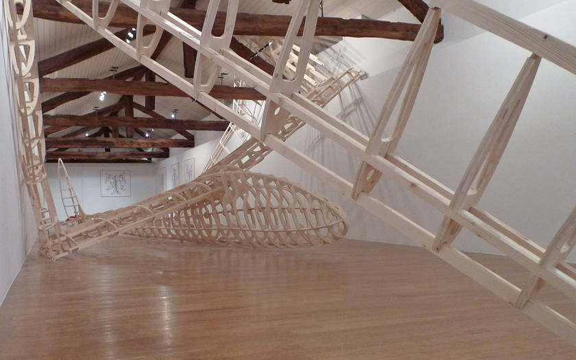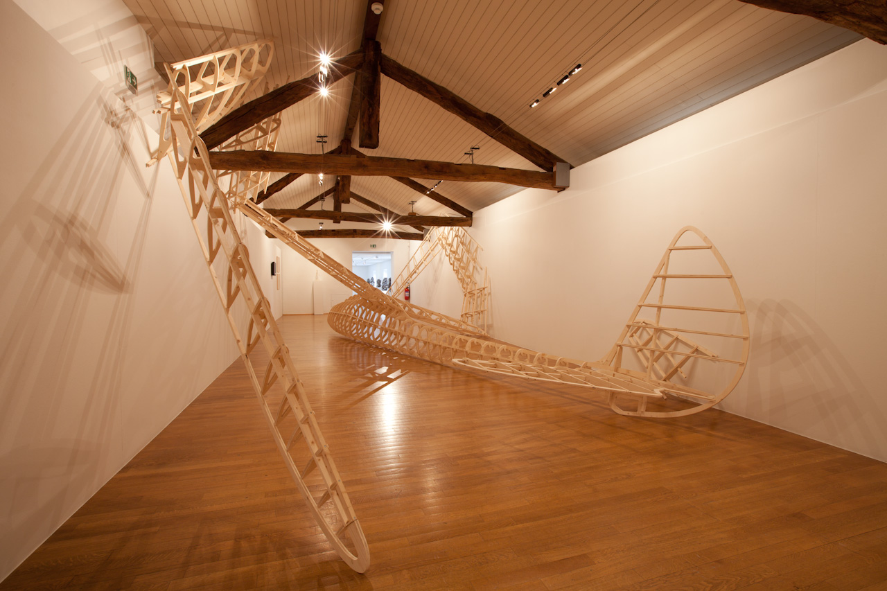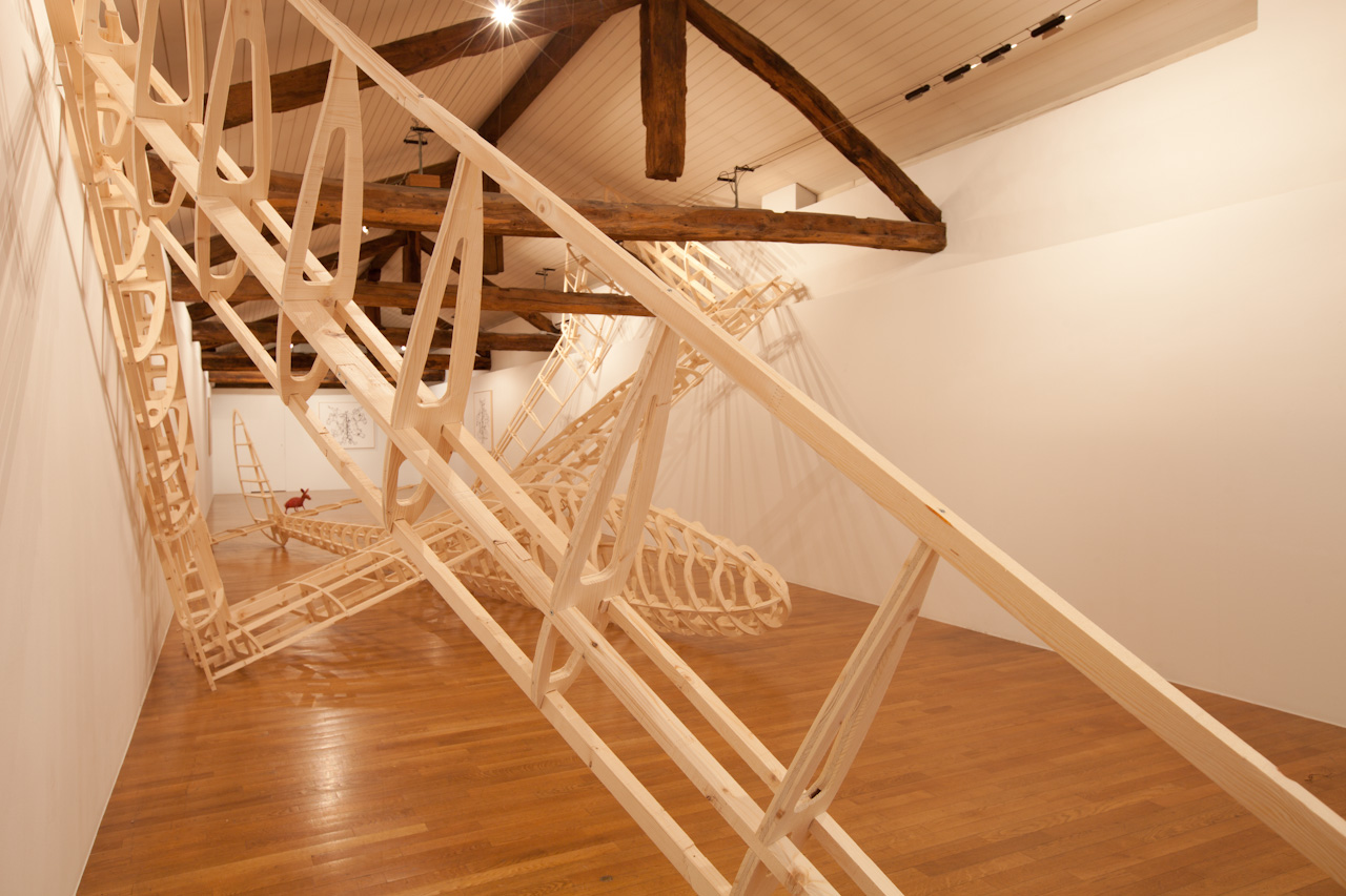 Name of a dragon in Norse mythology, Fafnir is also the name of a glider that was constructed in wood in Germany in the 1930s. Since, at one point, it was launched with an elastic at the top of the Jungfrau in Switzerland. The aerodynamic aircraft – recreated by enlarging a model to its original scale – is 20 meters wide and recalls the refined elegance of design of its time. In a precarious attempt to land inside a narrow confinement of a building, the structure has undergone an unfortunate contortion causing disfigurement and entrapment like a poor insect that either outgrew the space or got stuck in a hole too small to free itself.
