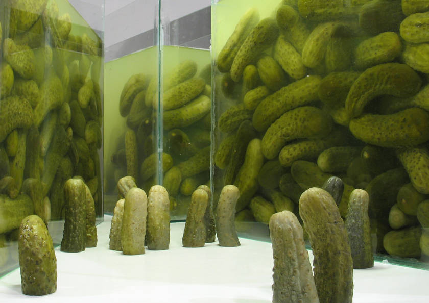 In this video, the setting is comically unsettling. Familiar gherkins are crammed together in baths of murky green pickle water like cadavers or penises in clear glass containers, or in plastic takeout containers invoking the image of babies in incubators . Then there are the standing gherkins that are looking at these preserved cucumbers as if in a museum or a laboratory. A dark humor lurks in this pickle-y dystopian scenario where the salted cucumbers are observing themselves in either prior or post life form.