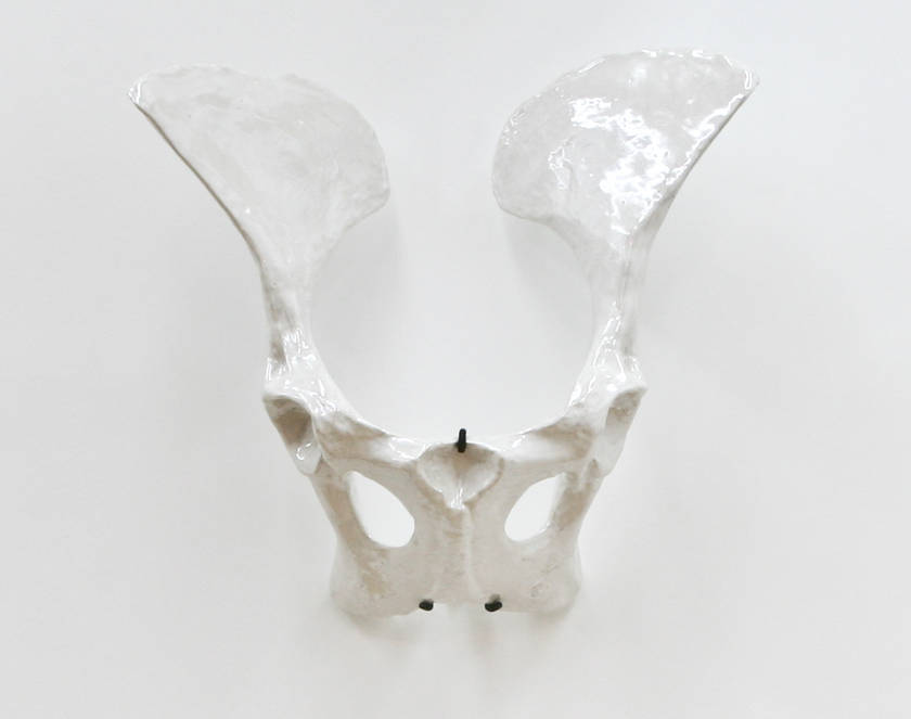 Molded from pelvis and vertebrae of a giraffe, the glazed ceramic casts with mother-of-pearl application create a kind of prehistoric pearl necklace, something that Fred Flinstone might have given to his wife Wilma as a gift. The practice of using dead animals and animal parts – from antlers to ivory – as decorations and adornments is nothing new. They are prized and possessed as indications of wealth and victory.