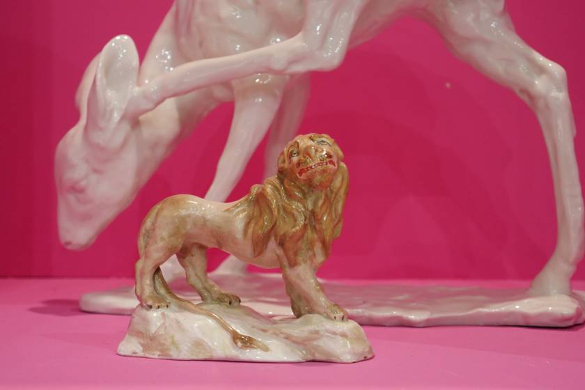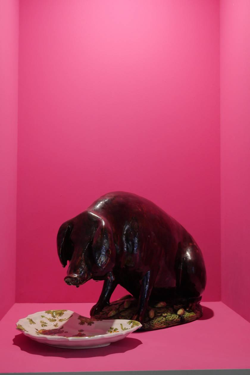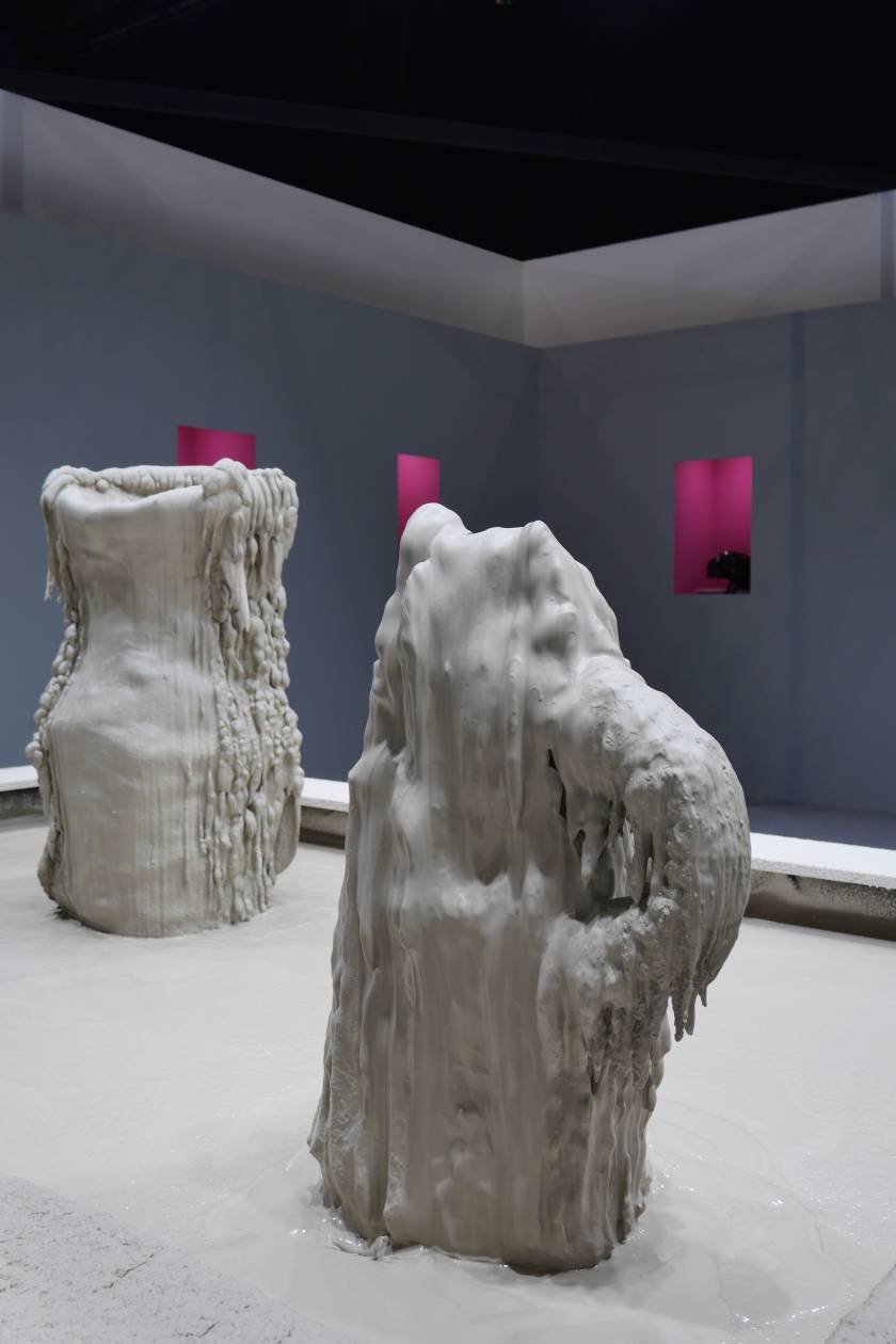 Invited by Ariana Museum to conceive and realize their booth for the contemporary art fair, Artgenève, Christian Gonzenbach selected two dozen of pieces in their archiv and installed them into pink wall boxes. In the center of the booth, a fountain made of porcelain mud spits every few minutes. The liquid clay mades two figures grow, a vase and a jug.