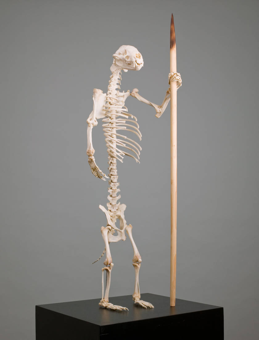 Like bears and badgers, humans are plantigrade animals, walking by using the entire sole of the foot. Through the real skeleton of a badger standing on its hind legs, by regression, the piece questions our animal origins and the meaning of our own evolution.