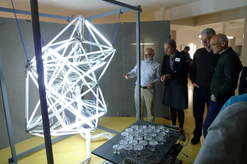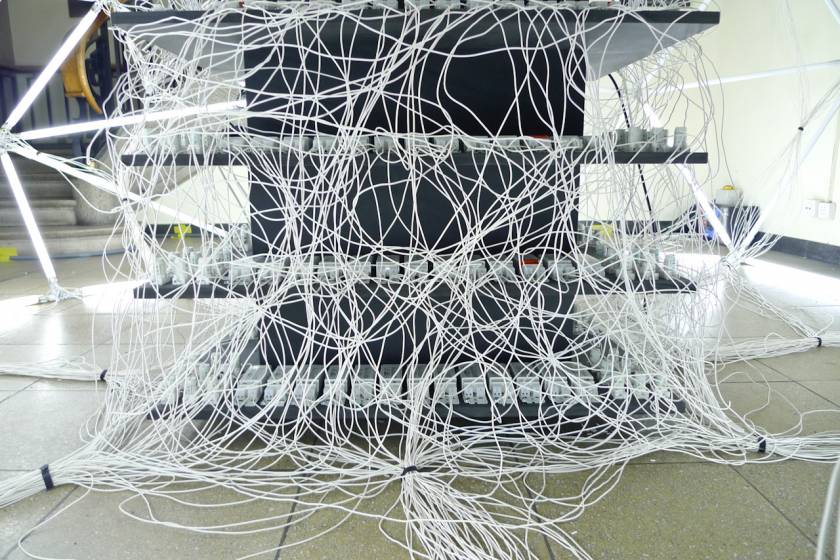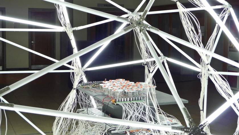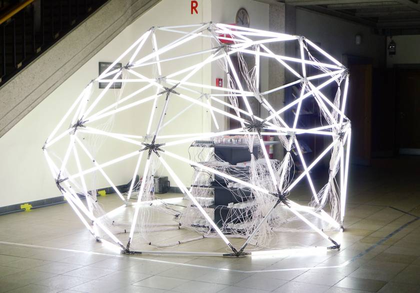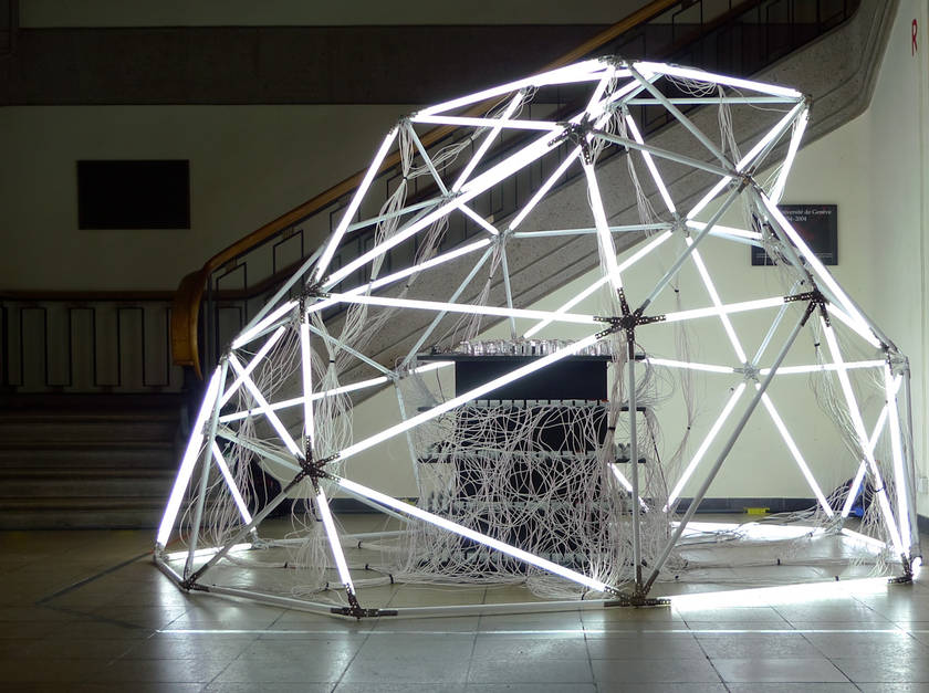 Quarc stands for Quantum Art Cloud. The igloo-like construction is made of a hundred standard fluorescent tubes connected by 1.5 km of cables. At the center of this device is a “mother brain” built with magnets and disks that has been designed to illuminate the tubes in a random sequence. Antithetically, as sophisticated and technically labored as it is, this work reflects a controlled situation in which unpredictability is the motivation behind a predictable mechanism.