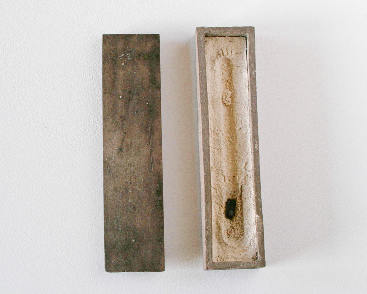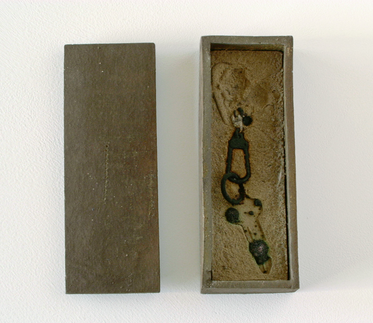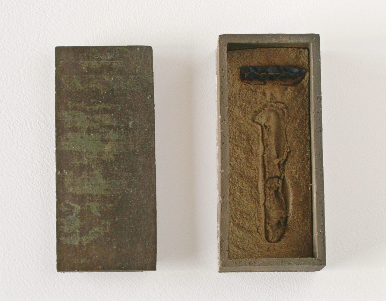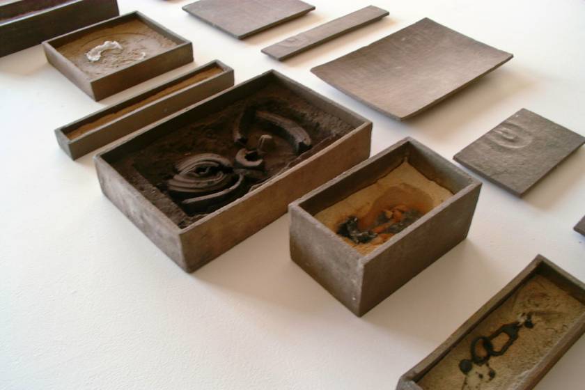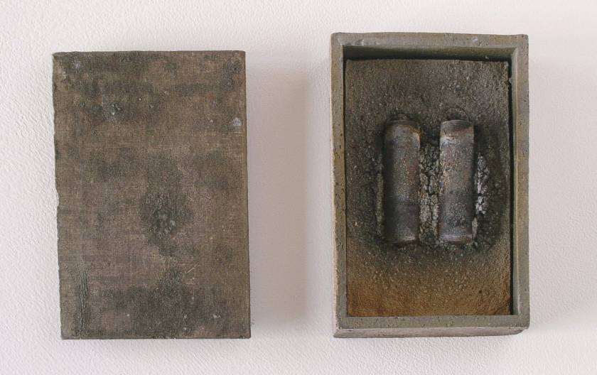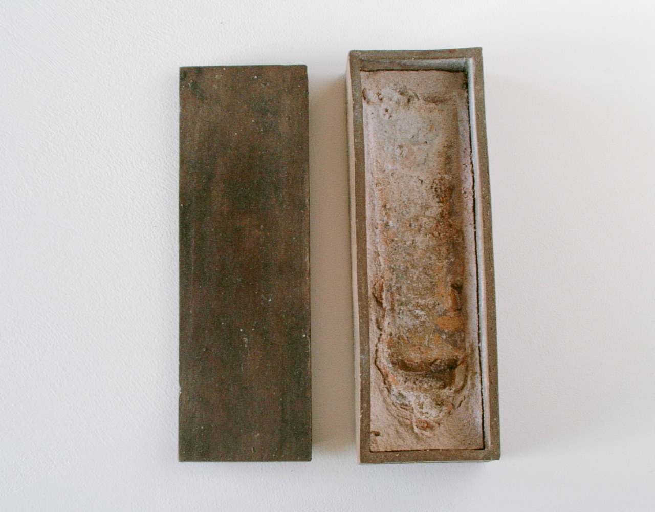 Realized in the land of the Rising Sun and echoing the Japanese art of wrapping, Funeral Rites consists of objects, such as batteries, a light bulb, a tube of toothpaste, a VHS, a lighter, etc., that are enclosed in ceramic boxes that act as coffins. Instead of being disposed like most everyday banal things, here the objects – at the end of their use, purpose – are treated to a noble ceremony. As if in the ritual of cremation, they are fired at 1200?C burning off all, including plastic and glass, but the outline traces of the oxidation of metal parts.