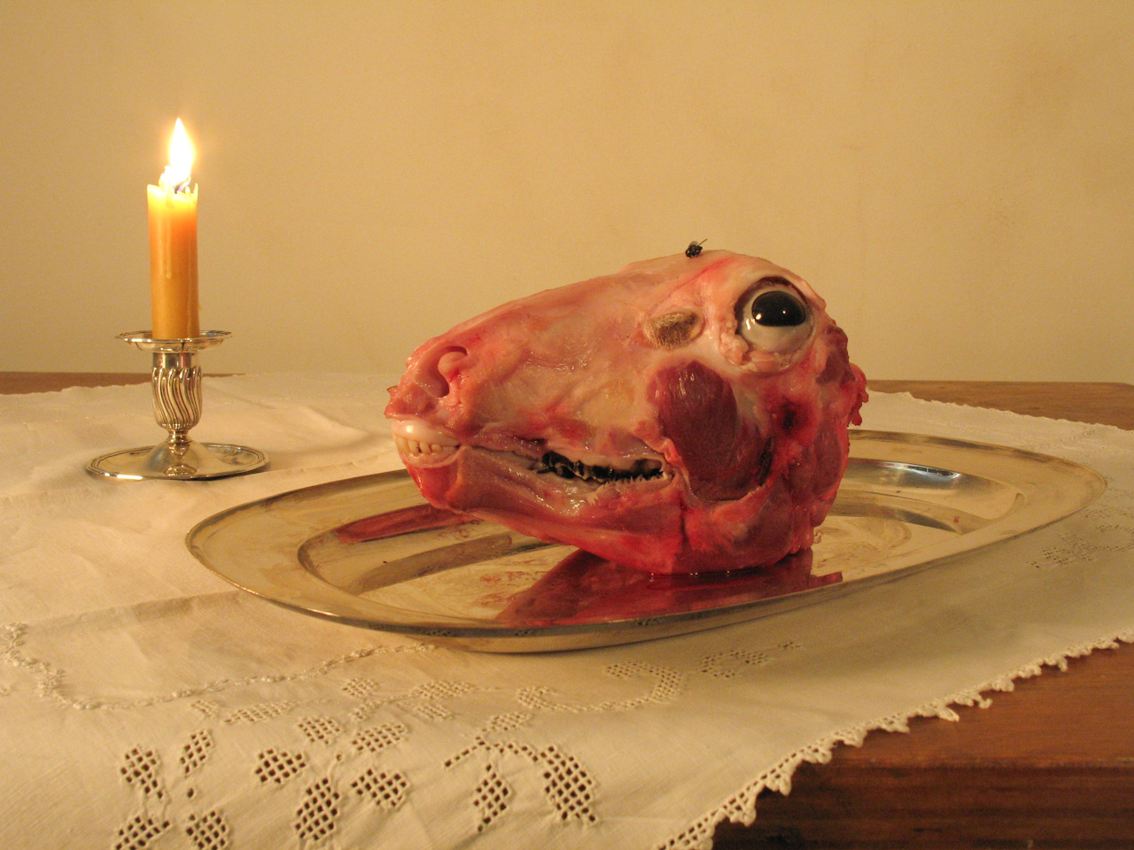 In this series of short videos, dead animals cross the bounds of mortality and become animate objects. Created as a simulacrum of the traditional still life paintings with dramatic natural light and lush amber hues, each video is imbued with the past, yet the dead animals are alive and moving: a rabbit and a duck engage in a post-mortem cuddle, a pigeon fidgets on its back and a sheep’s eye follows the buzzing fly above its head. With the use of skinned fleshy dead animals, these three compositions, or rather decompositions, contemplate the vanity of our existence.