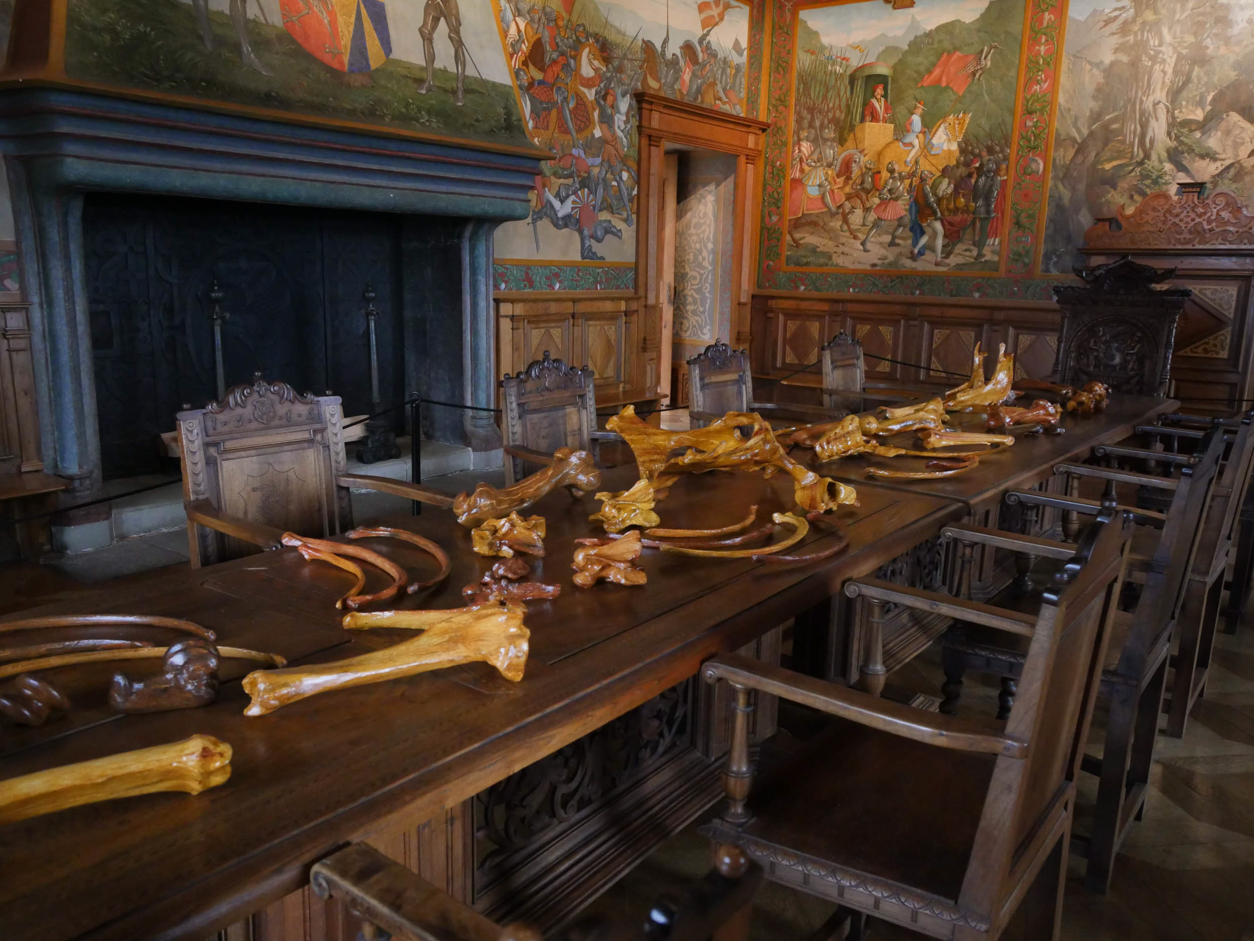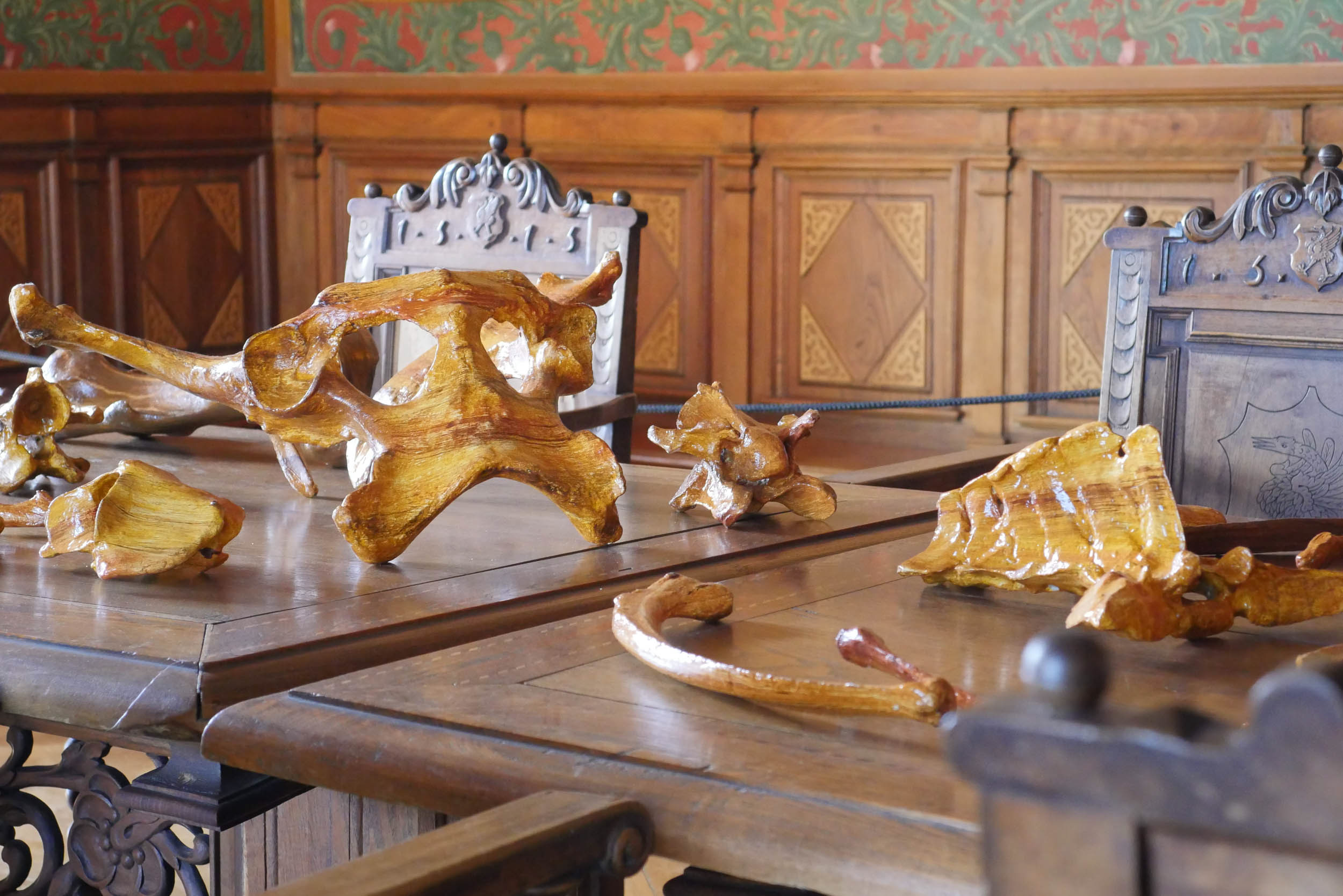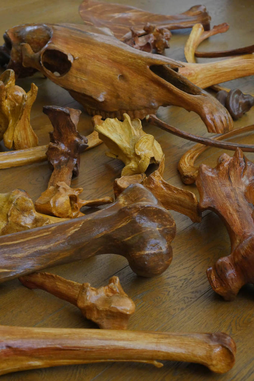 It is actually a real horse skeleton, painted in «faux-bois». All the elements of the story of Troy are present here: the wooden horse, the bones, the remains. And what would have happen if the Trojans would have eaten the wooden horse?