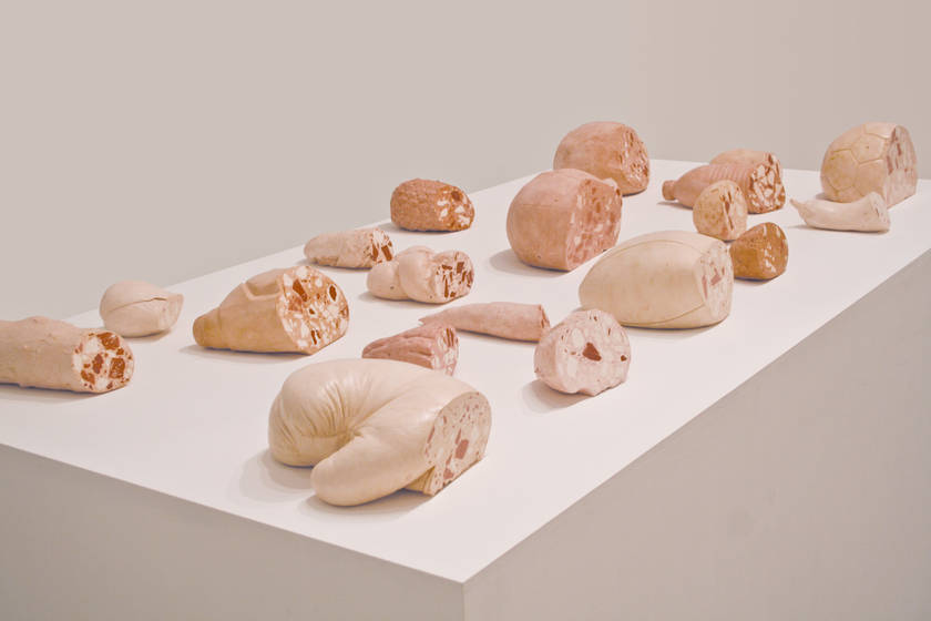 Entre nourriture et articles de sport, la chaire à saucisse ironise sur notre mode de vie par une illusion d’optique. De simple pains, des aubergines, des fruits ou des gants de boxe, des ballons de football, de rugby ont été moulés en silicone pour être reproduits, mous, en plâtre teinté dans la masse. Ces flasques objets ont ensuite été coupés comme des saucissons et présentent un côté net de la mortadelle rosée prête à l’emploi. Du pain et des jeux pour tous.