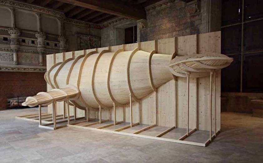 Hval – mot scandinave pour désigner la baleine – est une installation tridimensionnelle proche d’une construction navale savamment échafaudée. Constituée principalement de vide, celui laissé par le corps de la baleine disparue, cette sculpture monumentale joue sur l’opposition entre la construction navale géométrique de bois clair et le trou noir plus organique – qui, par ailleurs s’avère être une expérience visuelle forte – représentant le cétacé. Peu de limites séparent ici le bateau de sa proie.