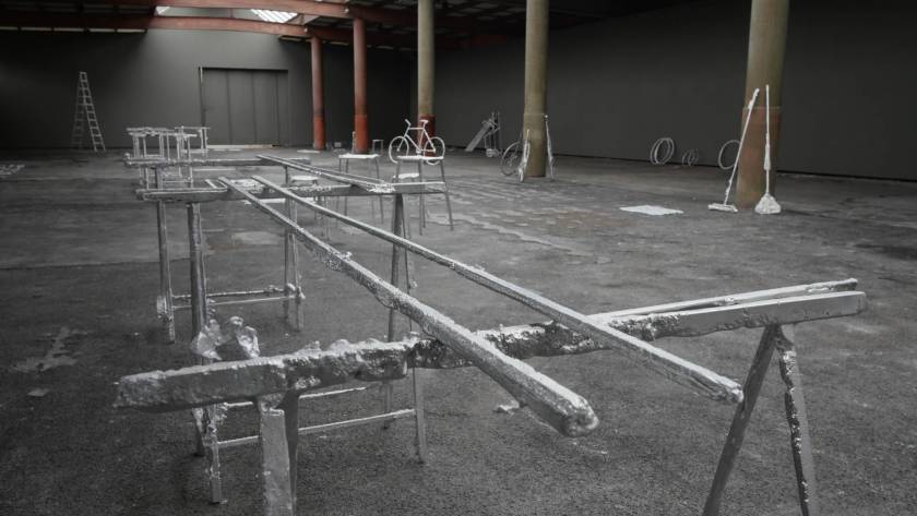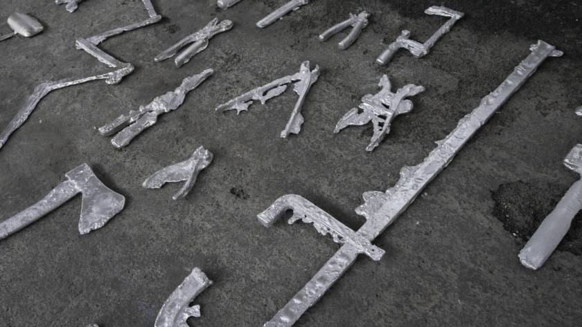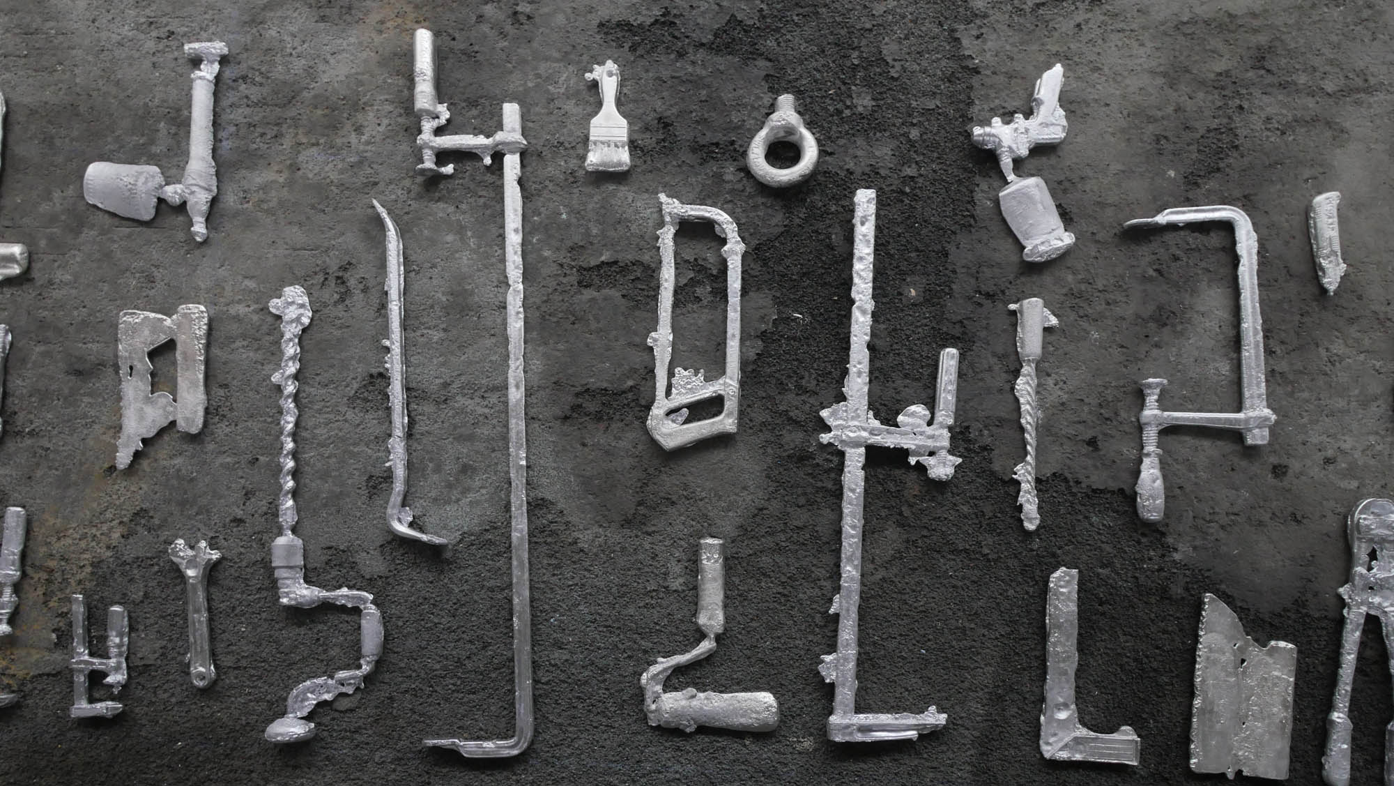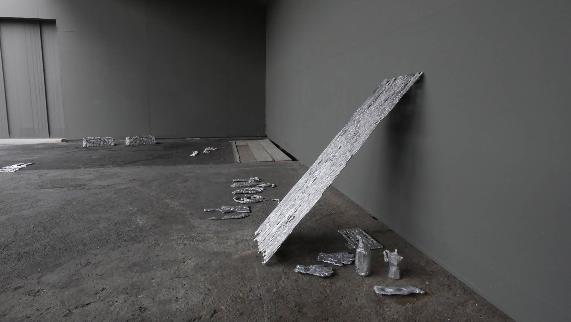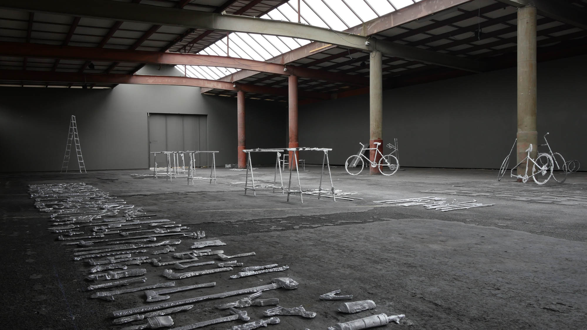 Une usine désaffectée transformée en centre d‘art contemporain retrouve son apparence d‘origine le temps de l‘exposition. Des objets y sont produits, ou plutôt des semi-objets, des fantômes ou des ombres. En tout une tonne d‘aluminium est fondue pour remplir l‘usine d‘ombres, ombres d‘outils, de mobilier, des choses dont on ne sait pas très bien si elles viennent d‘apparaître ou si elles sont en train de disparaître. Le geste de l‘Homme: transformer de la matière, lui donner une forme, à défaut d‘une fonction.