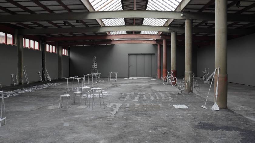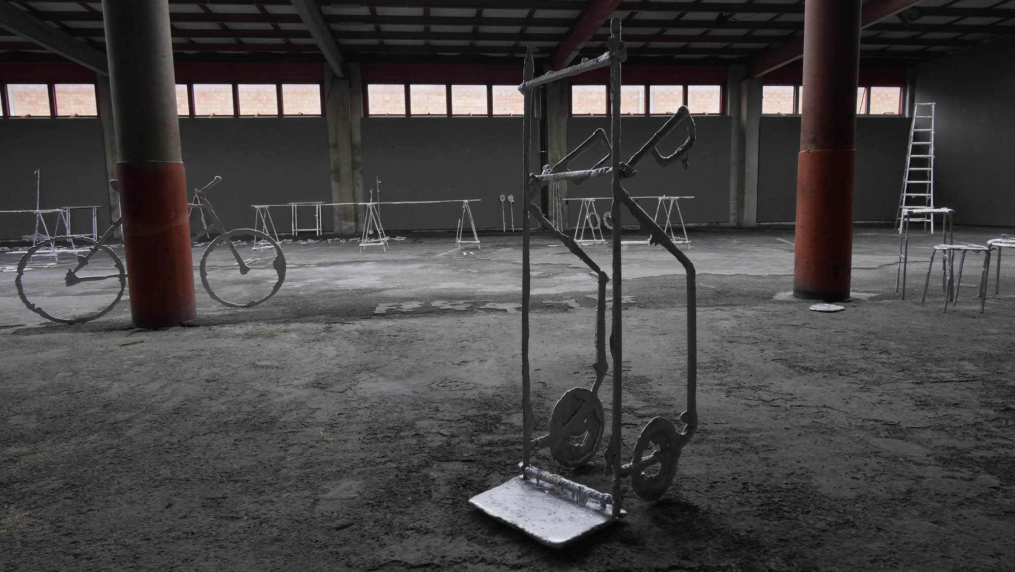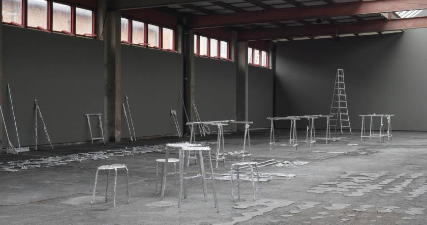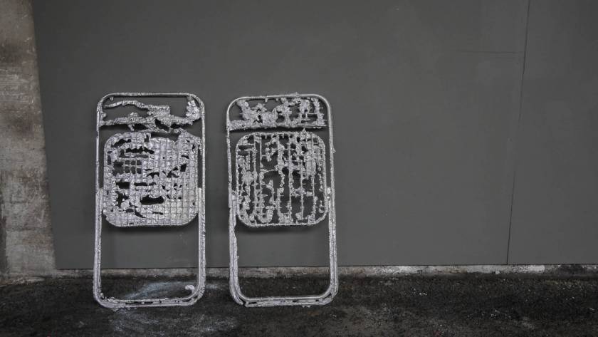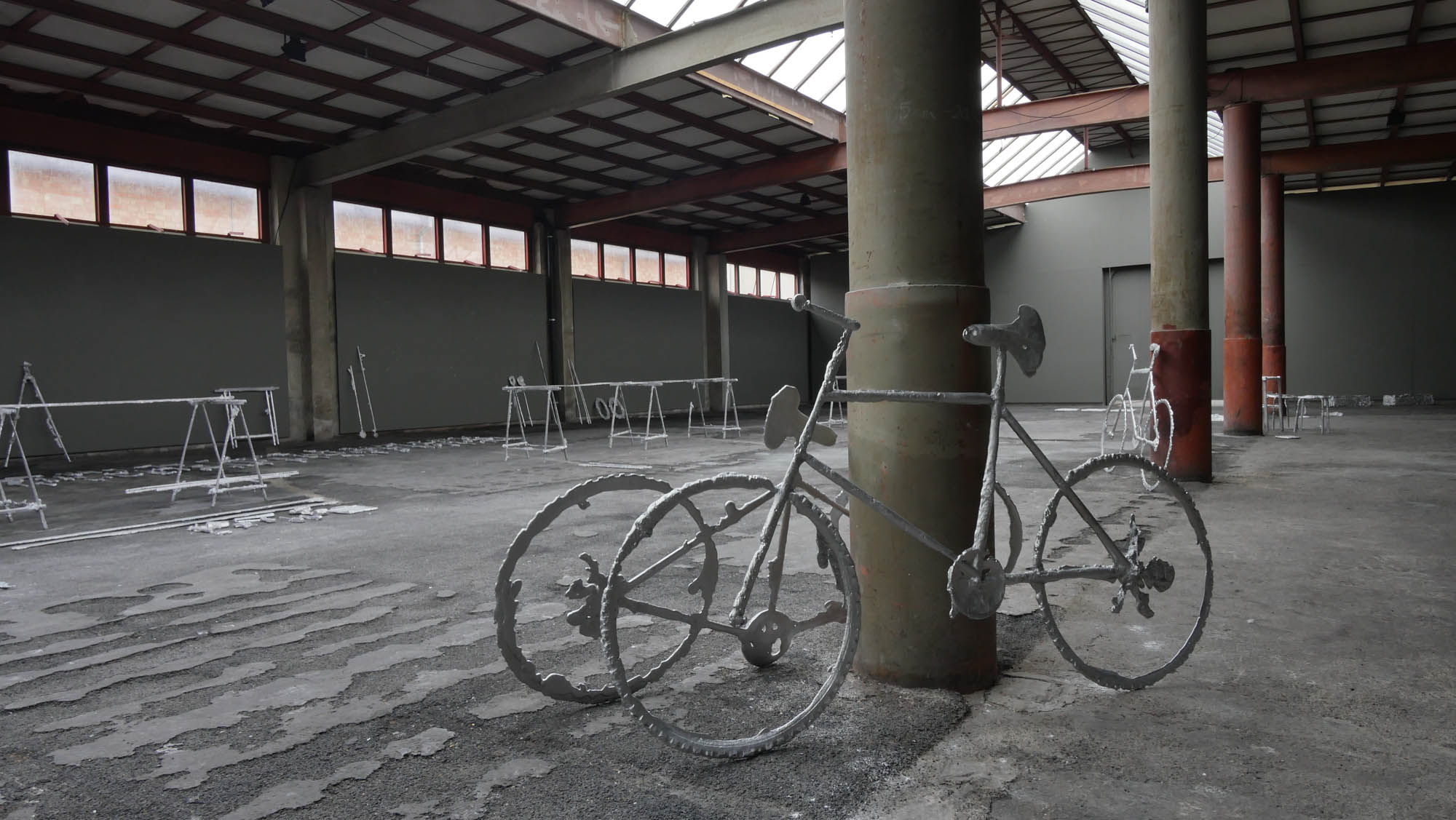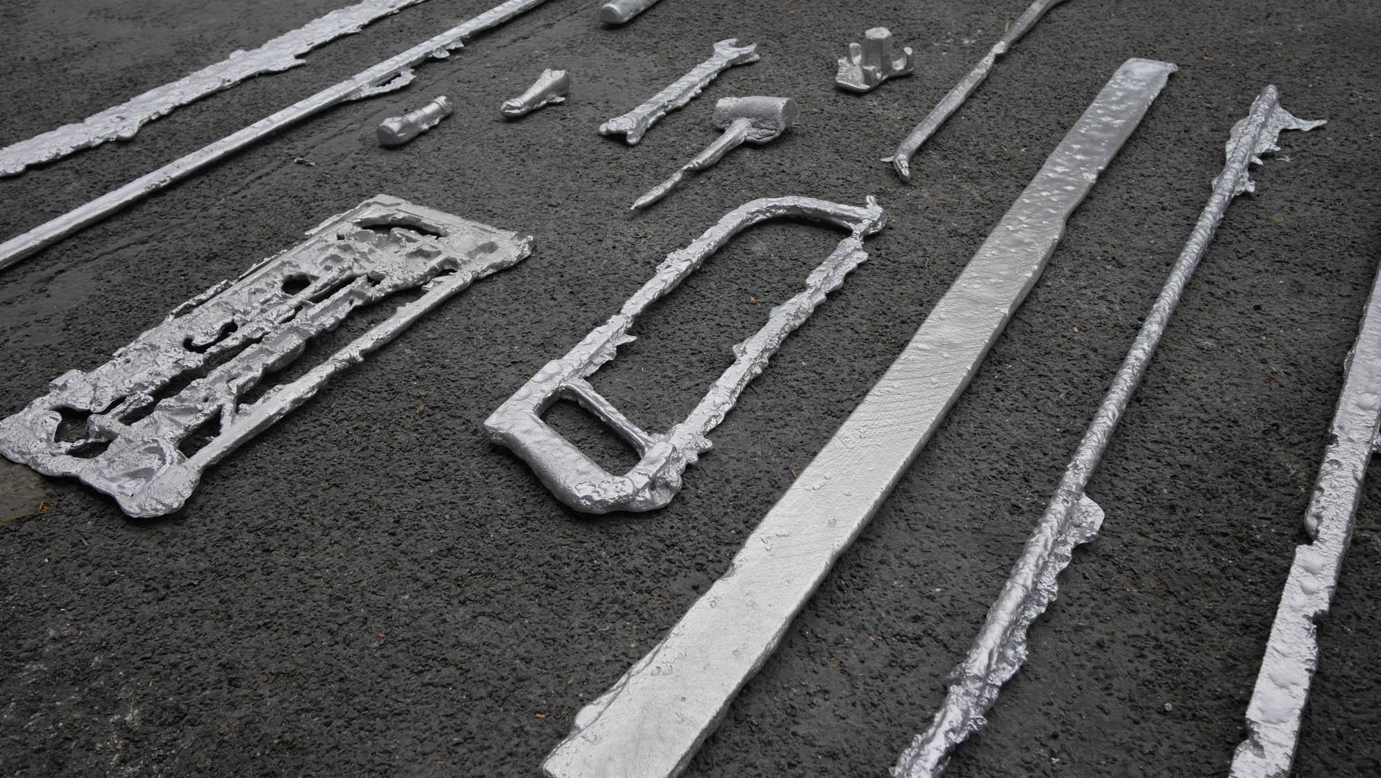 Une usine désaffectée transformée en centre d‘art contemporain retrouve son apparence d‘origine le temps de l‘exposition. Des objets y sont produits, ou plutôt des semi-objets, des fantômes ou des ombres. En tout une tonne d‘aluminium est fondue pour remplir l‘usine d‘ombres, ombres d‘outils, de mobilier, des choses dont on ne sait pas très bien si elles viennent d‘apparaître ou si elles sont en train de disparaître. Le geste de l‘Homme: transformer de la matière, lui donner une forme, à défaut d‘une fonction.